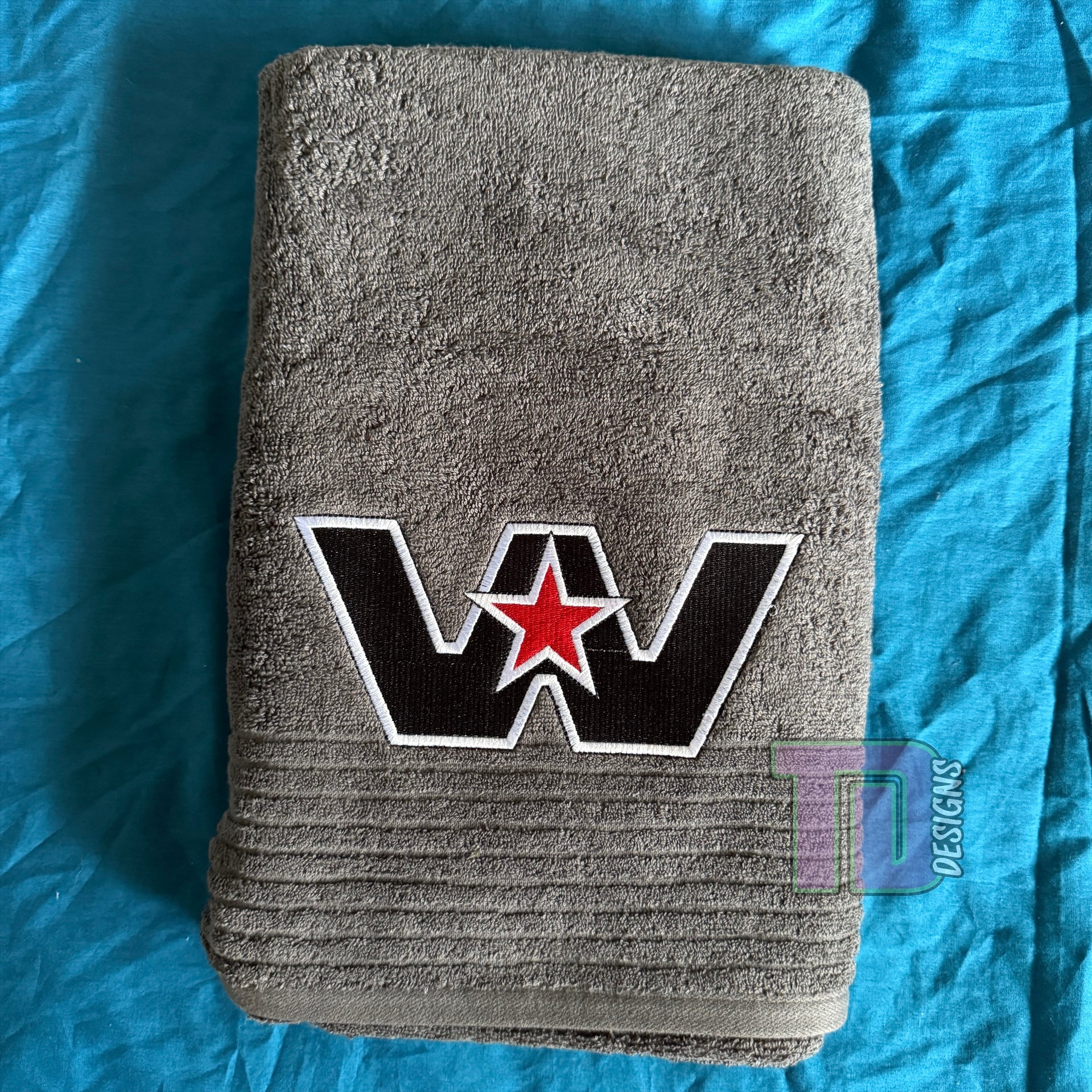 These bath sheets are 75cm x 1.5m which is a great size for anyone. The embroidery design is made to fit 200mm high so its not too big yet not too small.