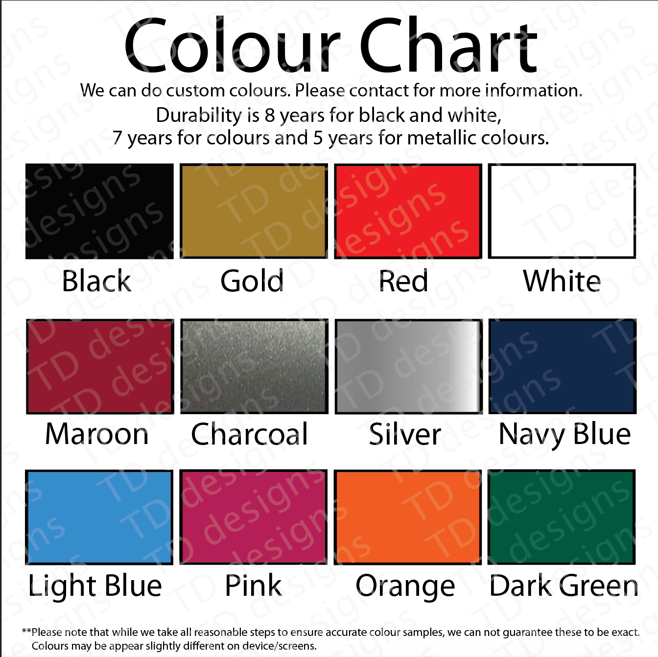 Durability is 8 years for black and white, 7 years for colours and 5 years for metallic colours.